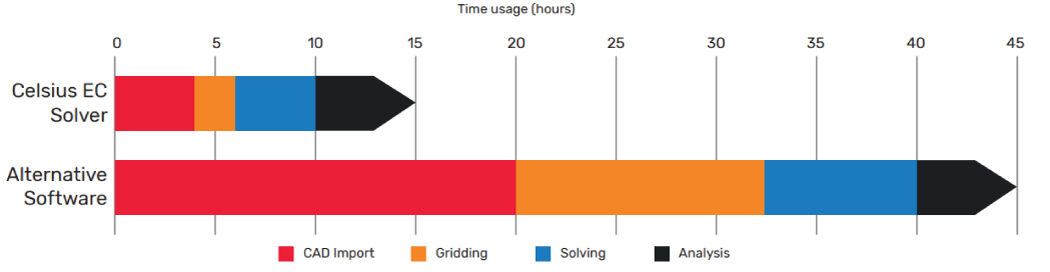 对Celsius EC求解器和一款同类热仿真工具进行了并列对比。该实验侧重于预处理、网格划分、求解和后处理环节。总共分析了12个不同大小和复杂度的案例。这款竞争软件尽管进行了大量简化,仍未能解决12个模型中的7个,且只能解决其余5个模型的高度简化版本。而Celsius EC求解器无需任何简化就能高效解决所有12个模型。如图1所示,Celsius EC求解器完成CAD导入、网格划分、模拟和分析仅用了15小时,而其他软件则需要45小时。
