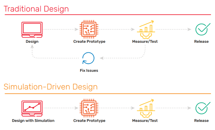 选择CelsiusEC求解器使罗德与施瓦茨的设计师能够显著缩短仿真运行时间,这减少了原型制作和测试所需的时间,最终提高了整体生产力和产品上市时间。图2对比了传统设计流程与仿真驱动的设计流程,后者改善了工作流程并加快了设计进程。